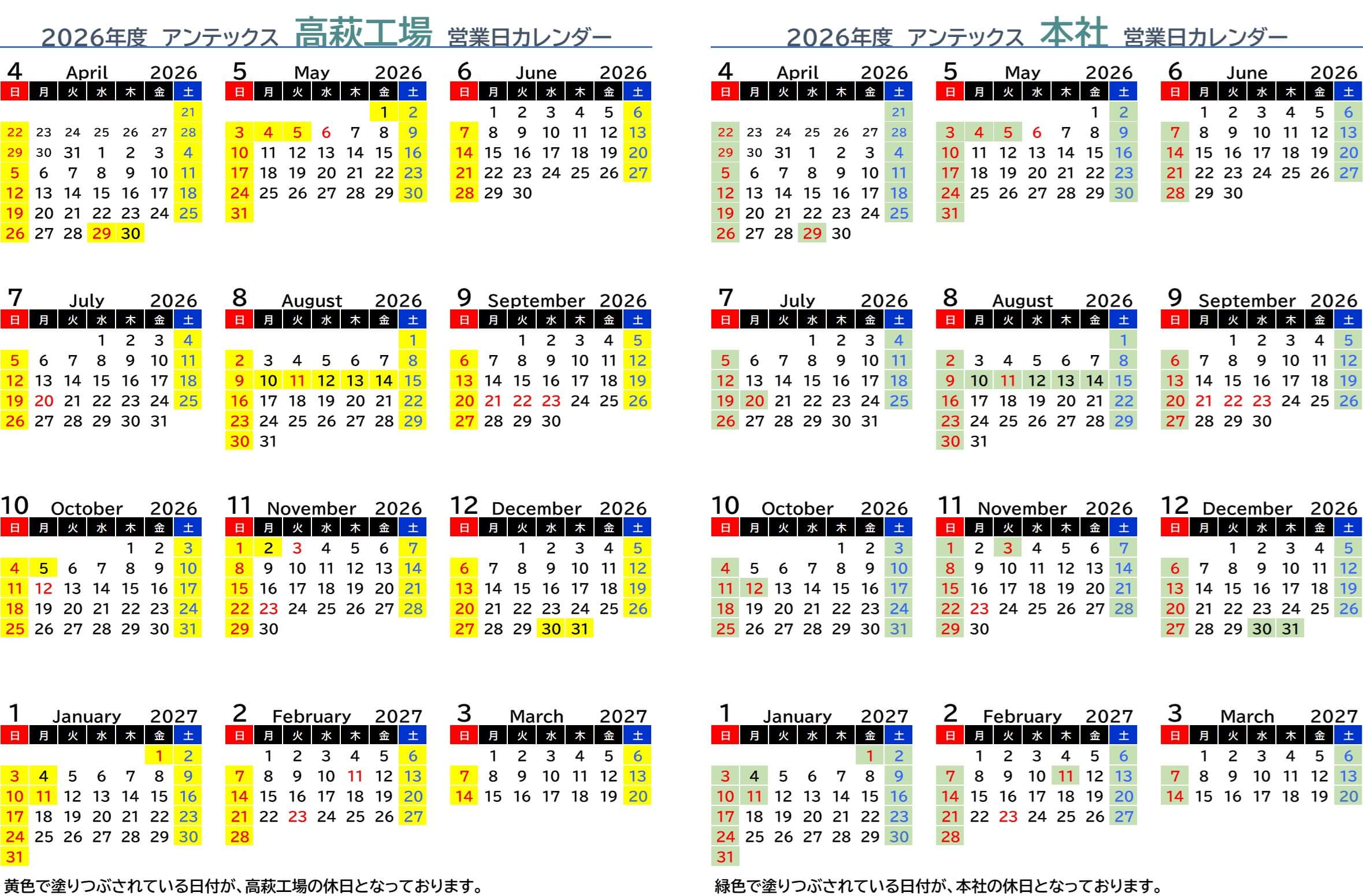 【2026年度 会社カレンダー】